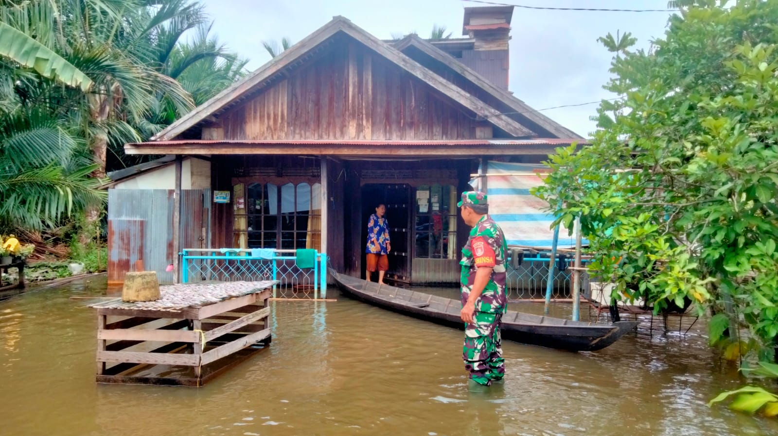 Tabalong – Babinsa Koramil 1008-06/Banua Lawas, Koptu Marselius, melaksanakan pemantauan kondisi banjir di Desa Sei Durian, Kecamatan Banua Lawas, Kabupaten Tabalong, pada siang hari ini. Dari hasil pemantauan, debit air di wilayah tersebut masih dalam kondisi aman, meskipun terdapat genangan air di beberapa titik jalan utama desa serta halaman rumah warga.(04/01)