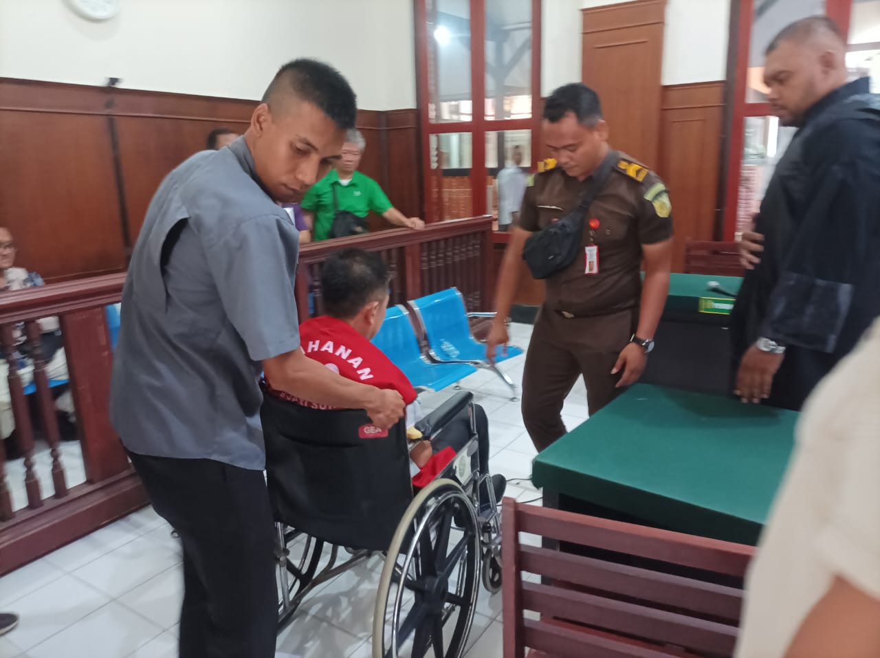 SINDORAYA.COM Surabaya – Terdakwa Effendi Pudjihartono pemilik restoran Sangria by Pianoza, terjatuh kehilangan keseimbangan dan keluar dari ruang persidangan Kartika 2 pada Pengadilan Negeri (PN) Surabaya menggunakan kursi roda.