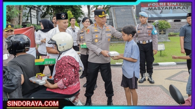 Kapolrestabes Surabaya Kombes Pol Luthfie Sulistiawan didampingi para Pejabat Utama (PJU) Polrestabes membagikan 300 paket takjil kepada para pengendara dan warga yang melintas.