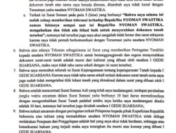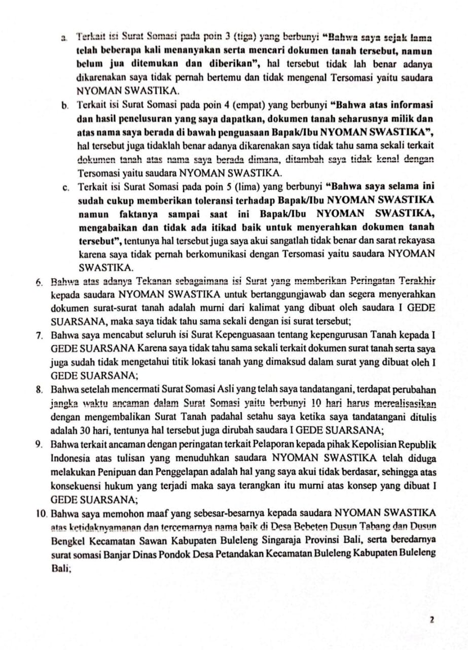 Terpantau wartawan, Dalam surat pernyataan itu, terdapat beberapa warga yang mengakui tidak mengenal pihak tersomasi termasuk Made Sudiana, dan oleh karena isi somasi tersebut terdapat potensi konsekuensi hukum, sehingga Made Sudiana mencabut kuasa dari Gede Suarsana dan menyampaikan permohonan maaf kepada pihak tersomasi.