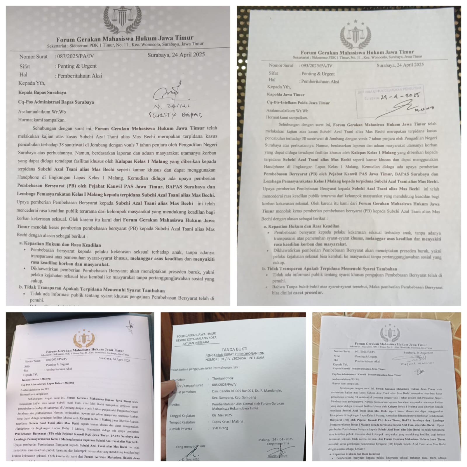 Sindoraya.com, Surabaya, – Aktivis Mahasiswa Hukum yang tergabung dalam Forum Gerakan Mahasiswa Hukum Jawa Timur menyatakan penolakan keras terhadap rencana pemberian Pembebasan Bersyarat (PB) kepada Subchi Azal Tsani alias Mas Bechi, terpidana kasus kekerasan seksual terhadap 38 santriwati di Jombang. Dalam pernyataan sikap resminya, mereka menganggap langkah tersebut sebagai bentuk ketidakadilan yang mencederai rasa keadilan korban dan masyarakat. Kamis, 24/04/2025.