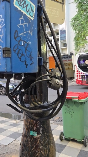 Kabel tersebut tidak tertata rapi dan keluar dari tempatnya yang seharusnya tempat (box) tersebut menjadi pengaman karena kabel tersebut mempunyai arus listrik bertegangan tinggi, bahkan beberapa di antaranya terlihat mengelupas sehingga menambah rasa kekhawatiran bagi pengguna jalan kaki yang melintas di dekatnya. Rabu, 23/04/2025.