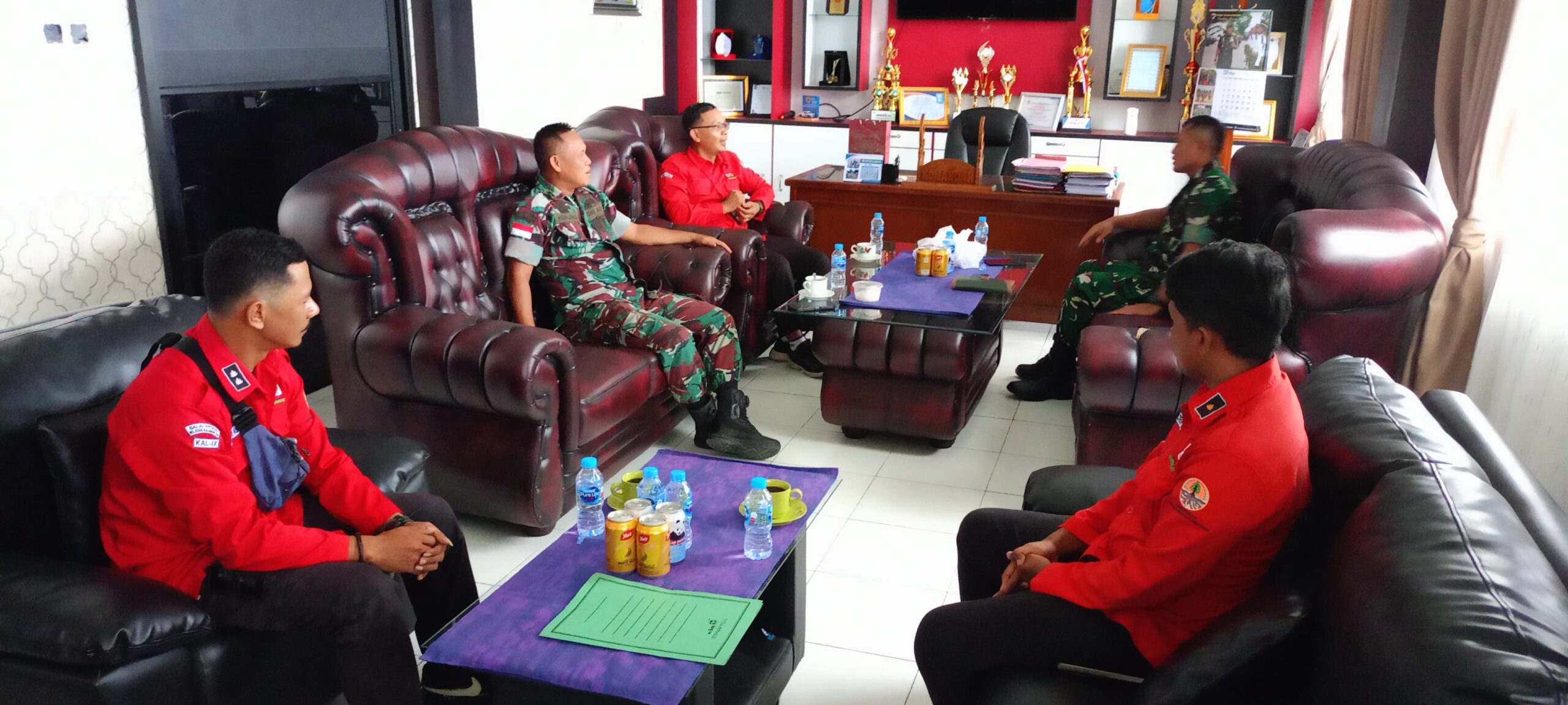 Koordinasi Pencegahan Karhutla dihadiri Dandim 1208/Sambas Letkol Czi Priyo Hindrarto S. I. P, Kapala Daops Manggala Agni Yuyun Wahyudin S. H, Polisi Kehutanan Pada Daops Manggala Fazrin Permana A Md, Pasi Ops Kodim 1208/Sambas, Kapten Arm Herlin Dinata dan Anggota Manggala Agni,