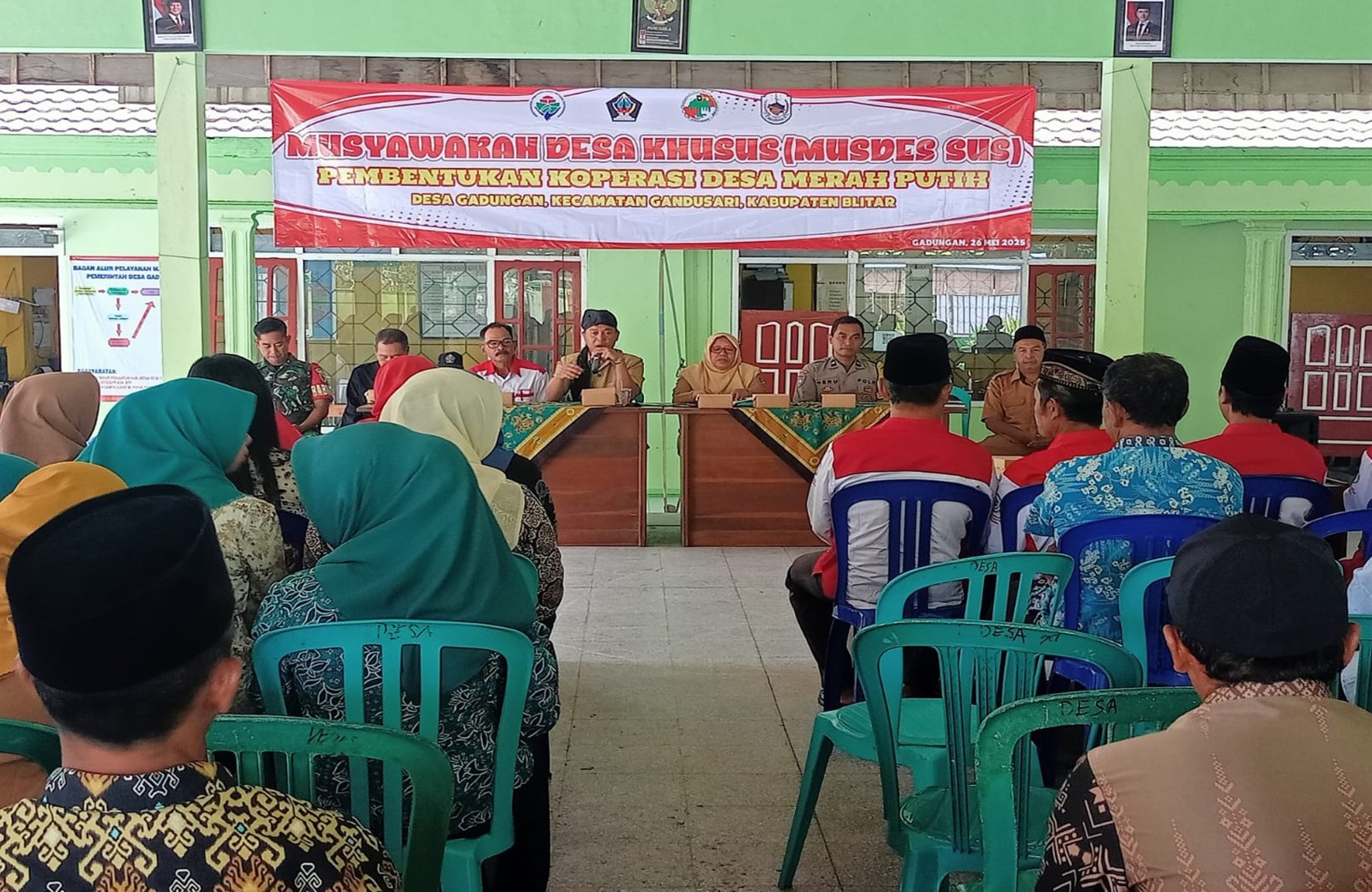 Blitar – Sinergi tiga pilar wujudkan kemandirian ekonomi warga, bertempat di Balai Desa Gadungan Kecamatan Gandusari Kabupaten Blitar, telah dilaksanakan Musyawarah Khusus Pembentukan Koperasi Merah Putih Desa Gadungan, Senin (26/5/2025). Kegiatan ini dihadiri oleh berbagai unsur pemerintahan dan masyarakat yang menunjukkan dukungan penuh terhadap penguatan ekonomi lokal melalui koperasi.