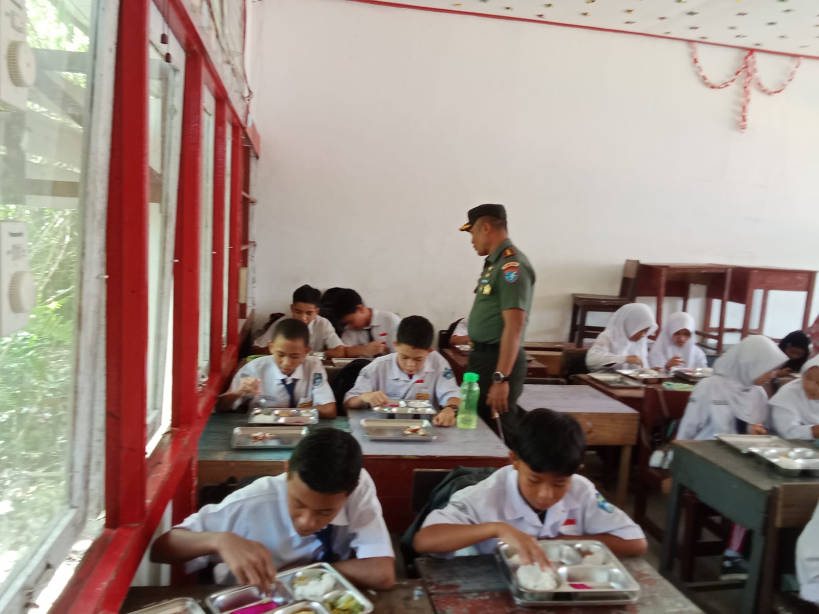Sambas, Komandan Kodim 1208/Sambas Letkol CZI Priyo Hindrarto,S.I.P meninjau pelaksanaan kegiatan pendistribusian Makan Siang Bergizi ke 6 Sekolah di Kec.Tebas Kab. Sambas, Senin (19/05/25).