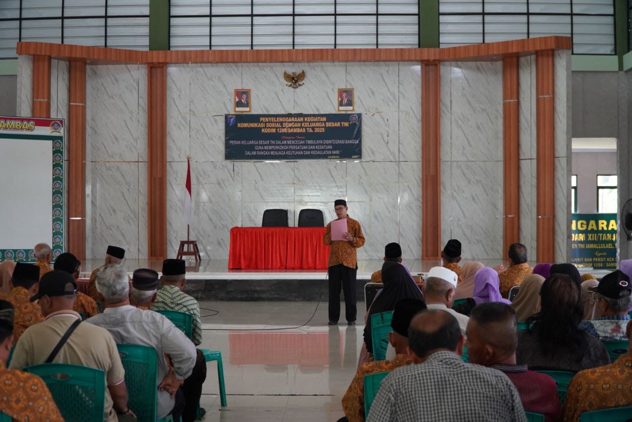 Sambas – Komando Distrik Militer 1208/Sambas melaksanakan acara Komsos (Komunikasi Sosial) dengan KBT (Keluarga Besar TNI) yang digelar di aula Makodim 1208/Sambas Jalan Tabrani, Desa Lumbang, Kec. Sambas, Kab. Sambas, (23/05/25).