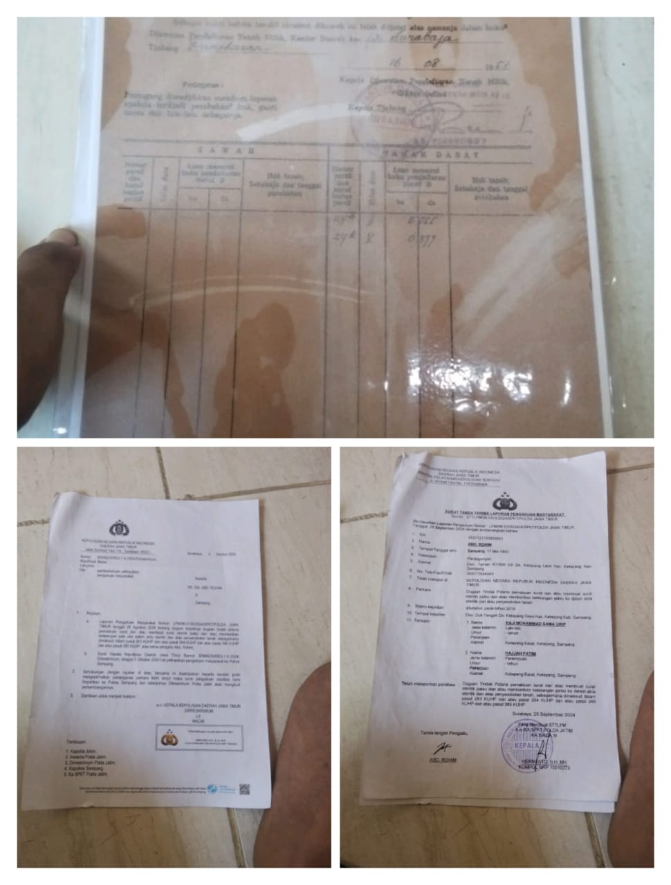 ABD Rohim melaporkan ke Polda Jatim atas kasus pemalsuan surat tanah yang dilakukan oleh H. Urib dengan memiliki surat SHM yang diterbitkan tahun 2012 lalu.