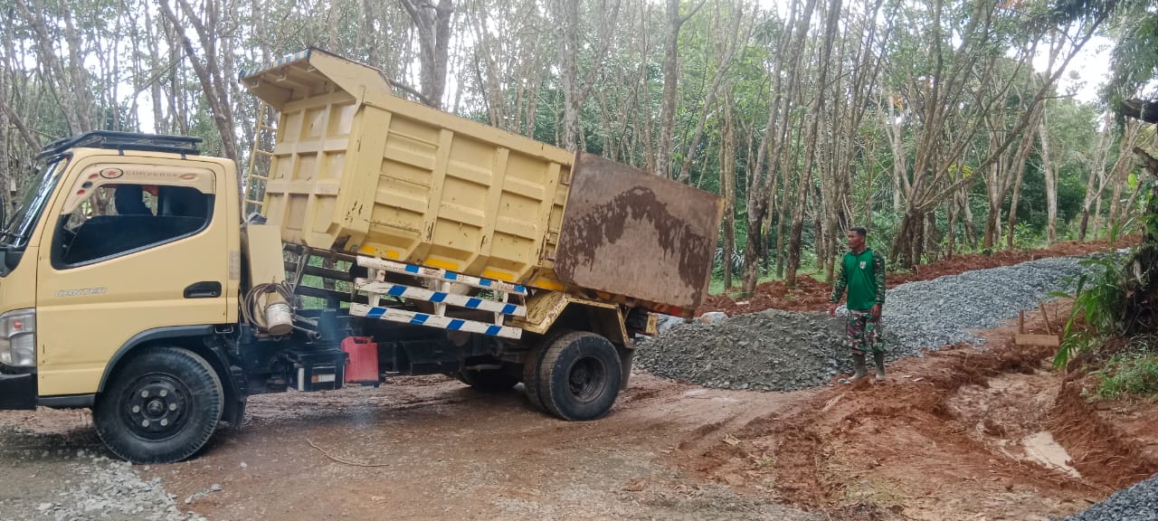Kapten Inf C. Indra Gunawan sebagai koordinator sasaran jalan terus berkomunikasi dengan pihak penyedia material agar selalu siap mengirimkan material yang dibutuhkan. Seperti tampak hari ini Kamis (08/05/2025), di mana puluhan truk bermuatan batu dan pasir silih berganti berdatangan.