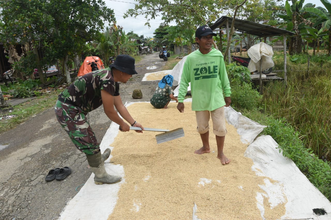 Di tengah berlangsungnya musim panen padi di wilayah pelaksanaan TMMD, anggota Satgas turut membantu warga menjemur hasil panen mereka.