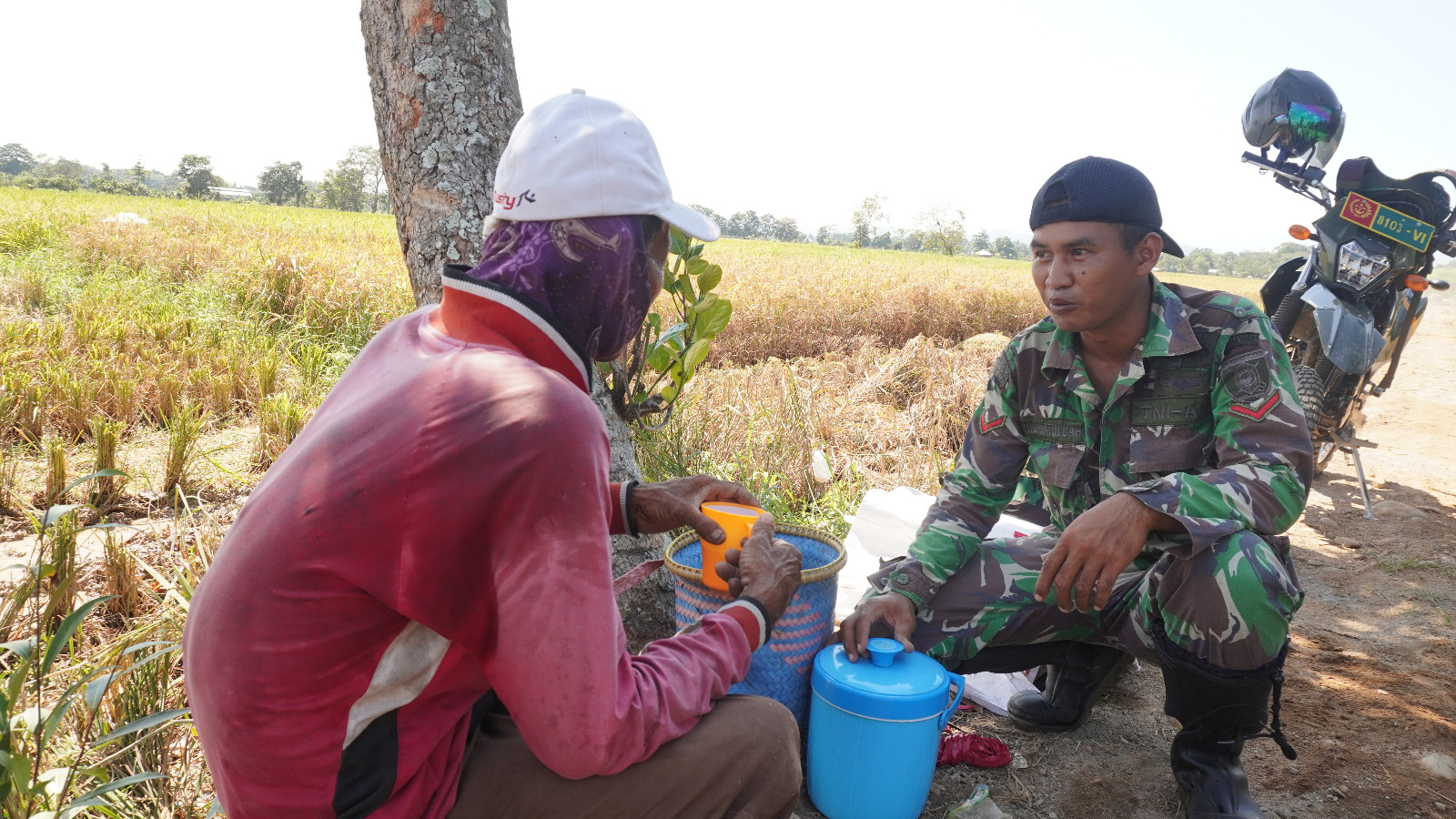 HARUYAN, HST – Di sela waktu istirahat siang, anggota Satuan Tugas (Satgas) TNI Manunggal Membangun Desa (TMMD) ke-124 Kodim 1002/Hulu Sungai Tengah (HST) memanfaatkan waktu untuk melaksanakan komunikasi sosial (komsos) dengan para petani di lokasi pembangunan jalan di Desa Pengambau Hilir Luar. Kegiatan ini berlangsung pada hari Kamis, 29 Mei 2025.