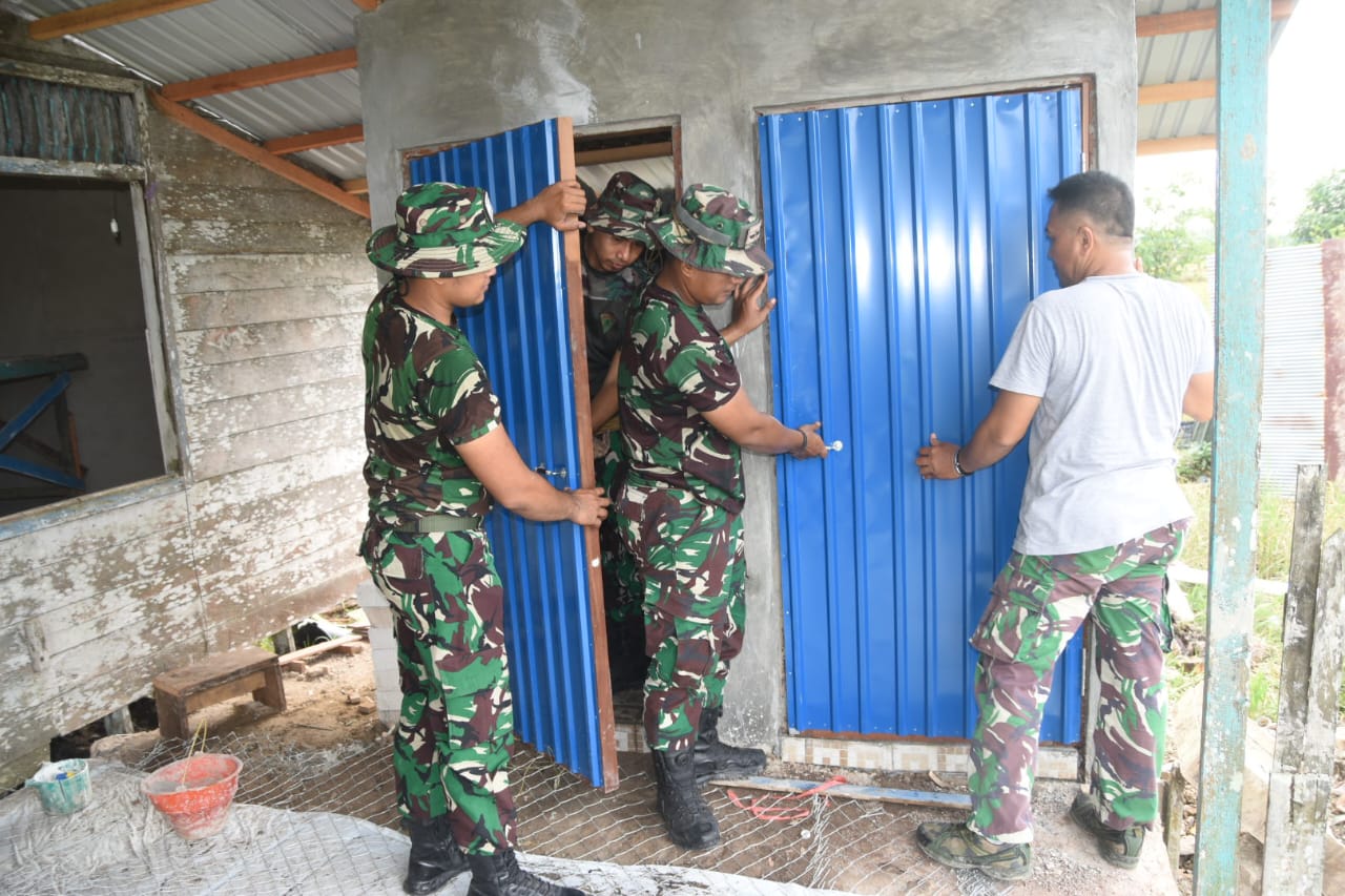 Pada Kamis (22/5), terpantau sejumlah anggota Satgas TMMD sedang fokus pada pemasangan pintu WC Langgar Darussalam.