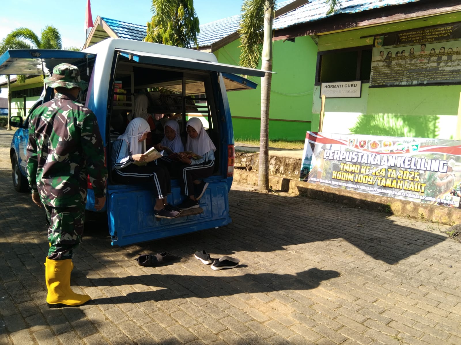Siswa-Siswi SDN 1 Gunung Melati Sambut Antusias Kehadiran Perpustakaan Keliling TMMD Ke-124 Kodim 1009/Tla