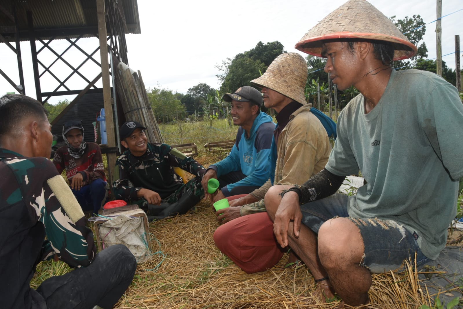 HARUYAN, HULU SUNGAI TENGAH – Memanfaatkan waktu rehat dari kegiatan pembangunan jalan, anggota Satuan Tugas (Satgas) TNI Manunggal Membangun Desa (TMMD) ke-124 Kodim 1002/Hulu Sungai Tengah (HST) terlihat akrab bercengkrama dengan warga di sekitar lokasi proyek. Minggu (11/5).