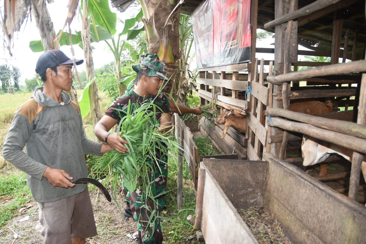 Pada Rabu (21/5) sore, usai beraktivitas di lokasi pembangunan, beberapa anggota Satgas TMMD menyambangi kediaman Bapak Uman, seorang peternak kambing di desa tersebut.