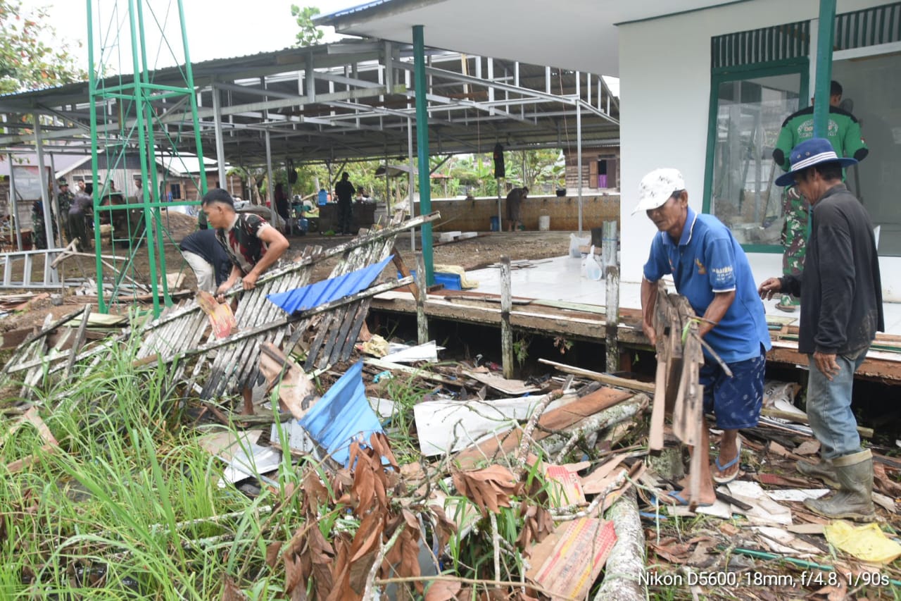 Haruyan, Hulu Sungai Tengah – Semangat gotong royong terlihat jelas di sekitar lokasi rehabilitasi rumah ibadah Langgar Darussalam di Desa Pengambau Hilir Luar.