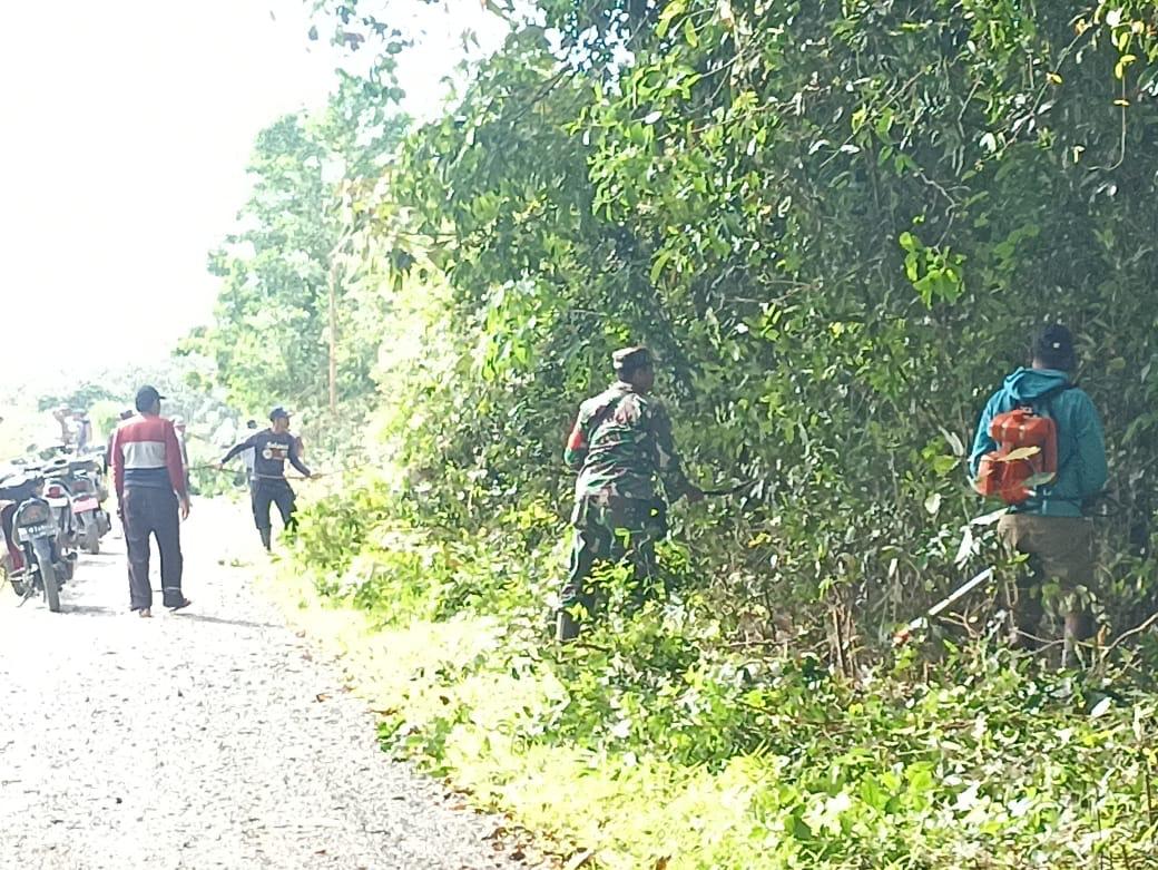 Tanah Laut – Babinsa Koramil 1009-04/Takisung, Kodim 1009/Tanah Laut Kopka Abu Hartoyo melaksanakan gotong royong pembersihan kanan kiri jalan di Desa Takisung, Kecamatan Takisung, Kabupaten Tanah Laut, Jumat (28/06/2025).