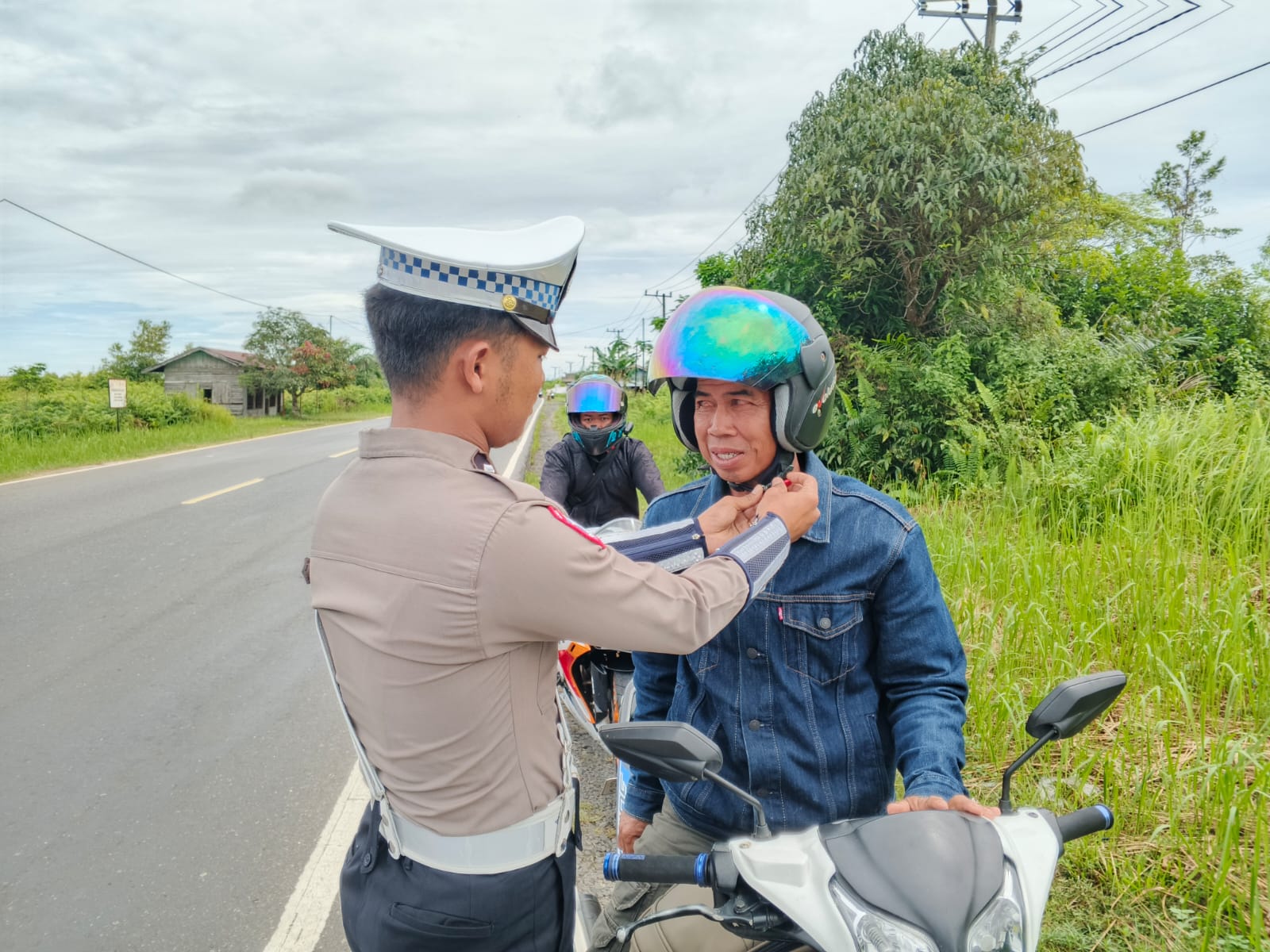 Polres Pulang Pisau – Satuan Lalu Lintas – Dengan Senyuman yang ramah Personel Satlantas Polres Pulang Pisau mengingatkan pengendara roda dua agar selalu klik helm saat berkendara. Rabu (4/6/2025).