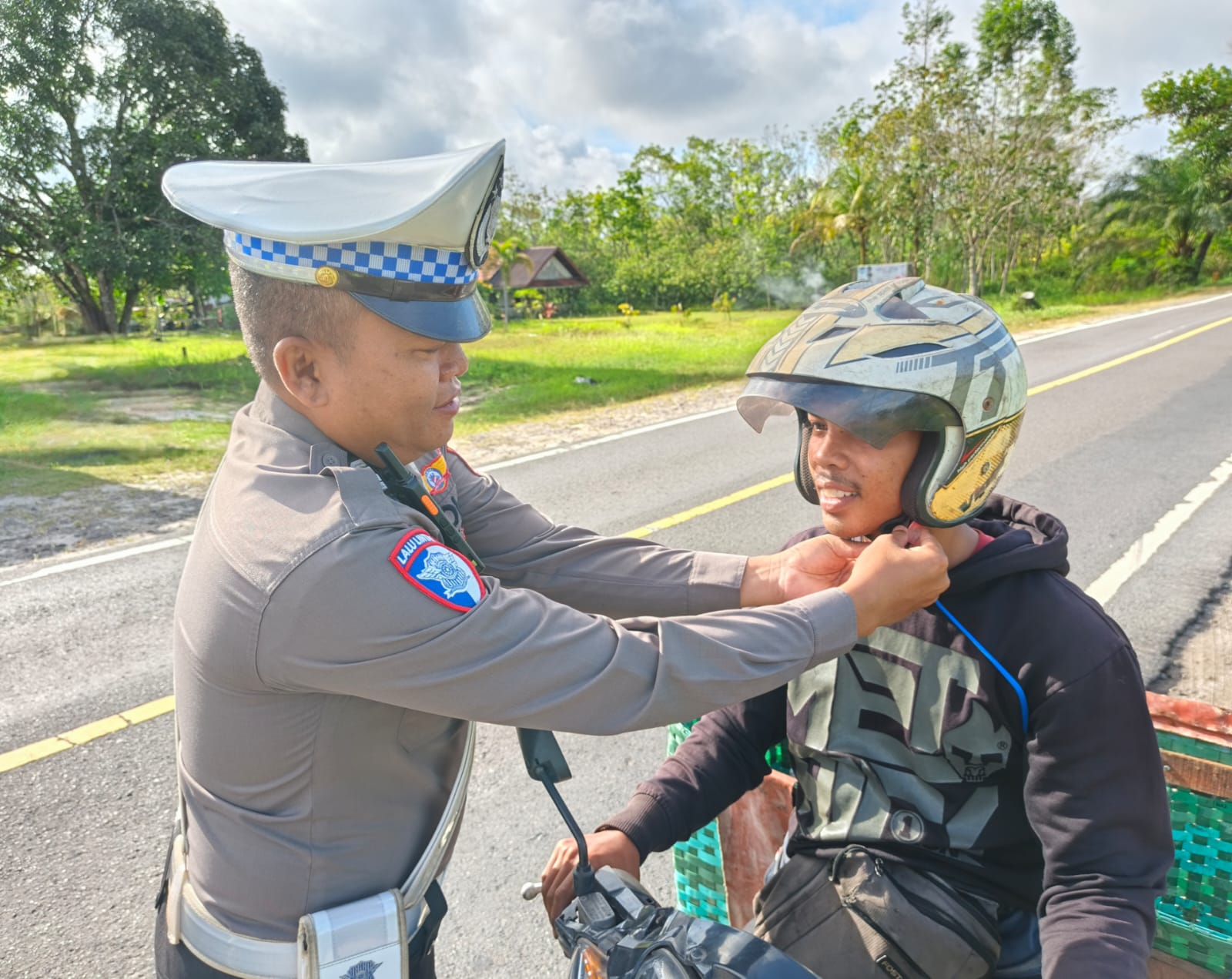 Polres Pulang Pisau – Satuan Lalu Lintas – Dengan Senyuman yang ramah Personel Satlantas Polres Pulang Pisau mengingatkan pengendara roda dua agar selalu klik helm saat berkendara. Senin (9/6/2025).