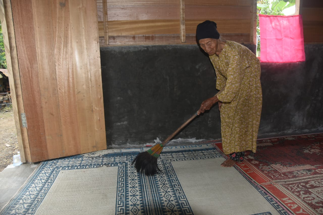Pagi ini, Senin (09/06), Nenek Kurba (81) terlihat antusias menyapu lantai rumahnya yang baru selesai dibangun melalui program TMMD tersebut.