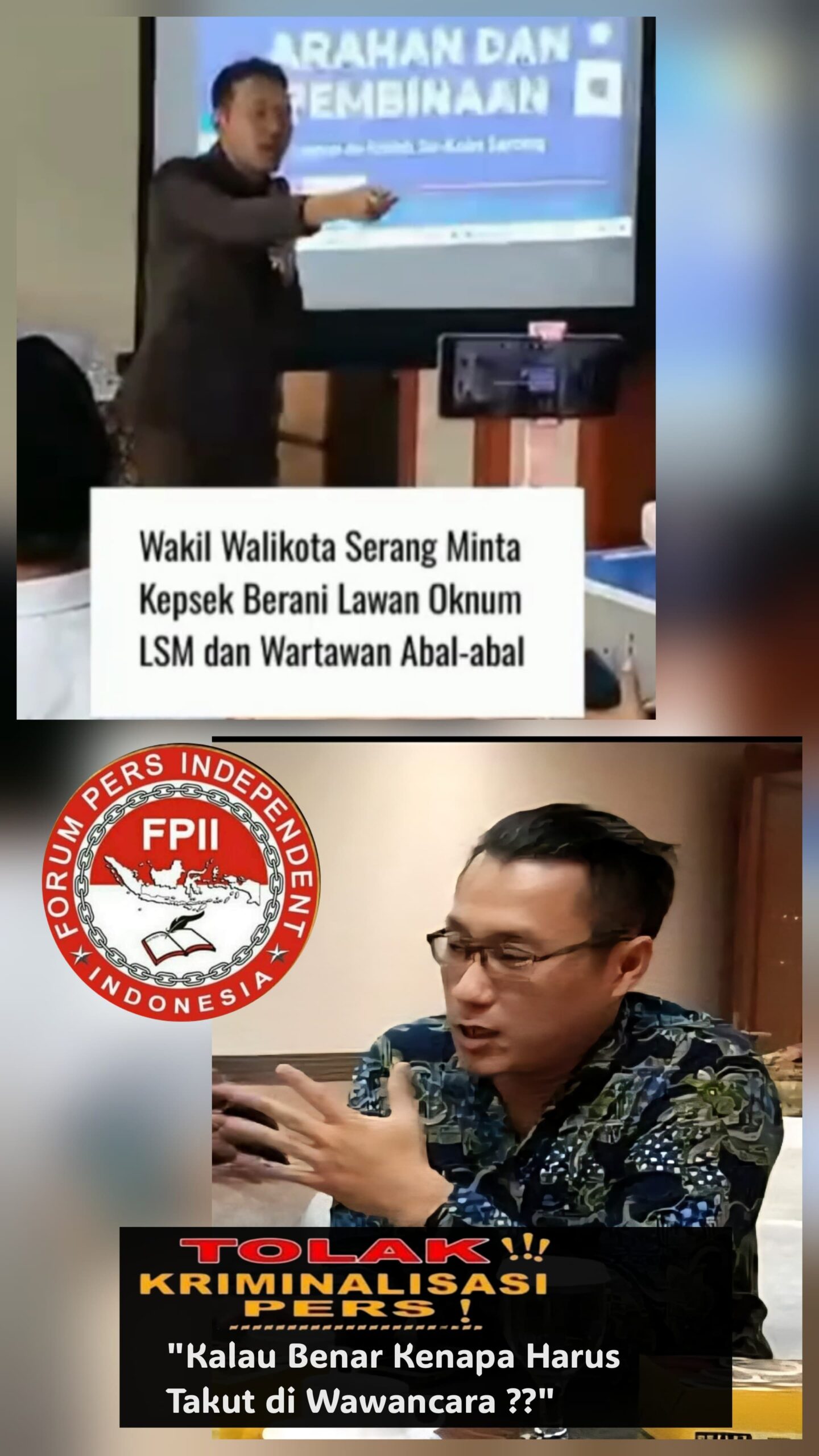 Kami Organisasi Pers Forum Pers Independent Indonesia (;FPII) kecam keras dan ingatkan Wakil Walikota Serang jangan membuat pernyataan yang tidak etis dan menyebarkan kebencian terhadap insan pers , karena pernyataan ini memperkuat pentingnya ruang demokrasi dan kebebasan pers sebagai pilar dalam sistem pemerintahan yang transparan dan akuntabel.