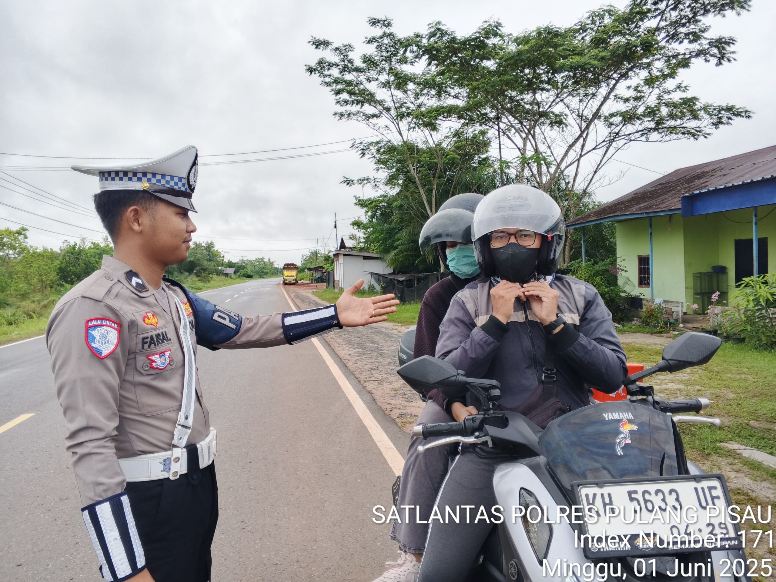 Polres Pulang Pisau – Satuan Lalu Lintas – Dengan Senyuman yang ramah Personel Satlantas Polres Pulang Pisau mengingatkan pengendara roda dua agar selalu klik helm saat berkendara. Minggu (1/6/2025).