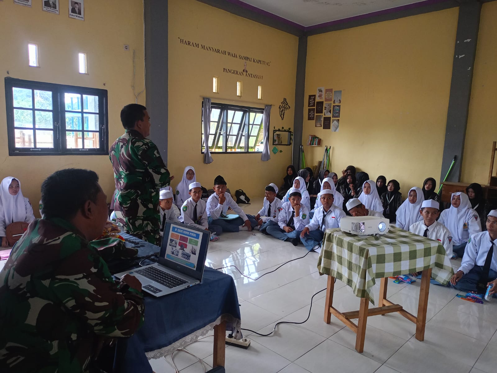 Barabai – Danramil 1002-08/Labuan Amas Utara, Kapten Inf Rudi Hartono, memberikan materi Wawasan Kebangsaan dalam rangka kegiatan Masa Pengenalan Lingkungan Sekolah (MPLS) di Madrasah Aliyah (MA) Muhajirin, Desa Pemangkih Seberang, pada Selasa (15/7).