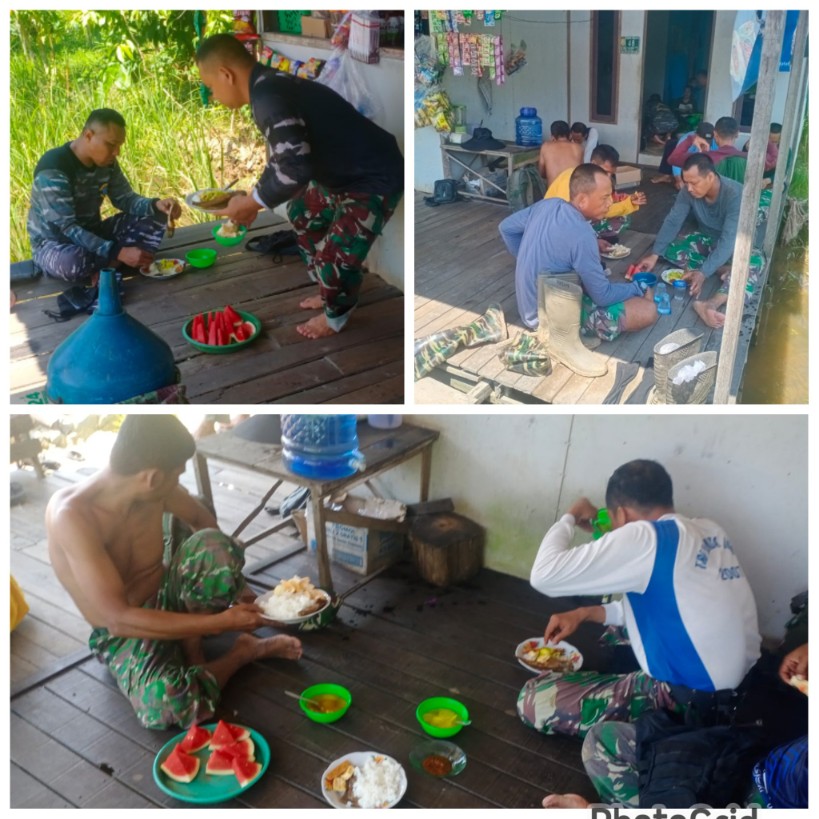 Kegiatan makan siang bersama ini bukan sekadar pengisi waktu istirahat, tetapi menjadi momen mempererat hubungan antara prajurit TNI dan masyarakat. Duduk bersila di atas tikar seadanya, anggota Satgas dan warga menikmati hidangan sederhana yang disiapkan secara gotong royong oleh para ibu-ibu setempat.