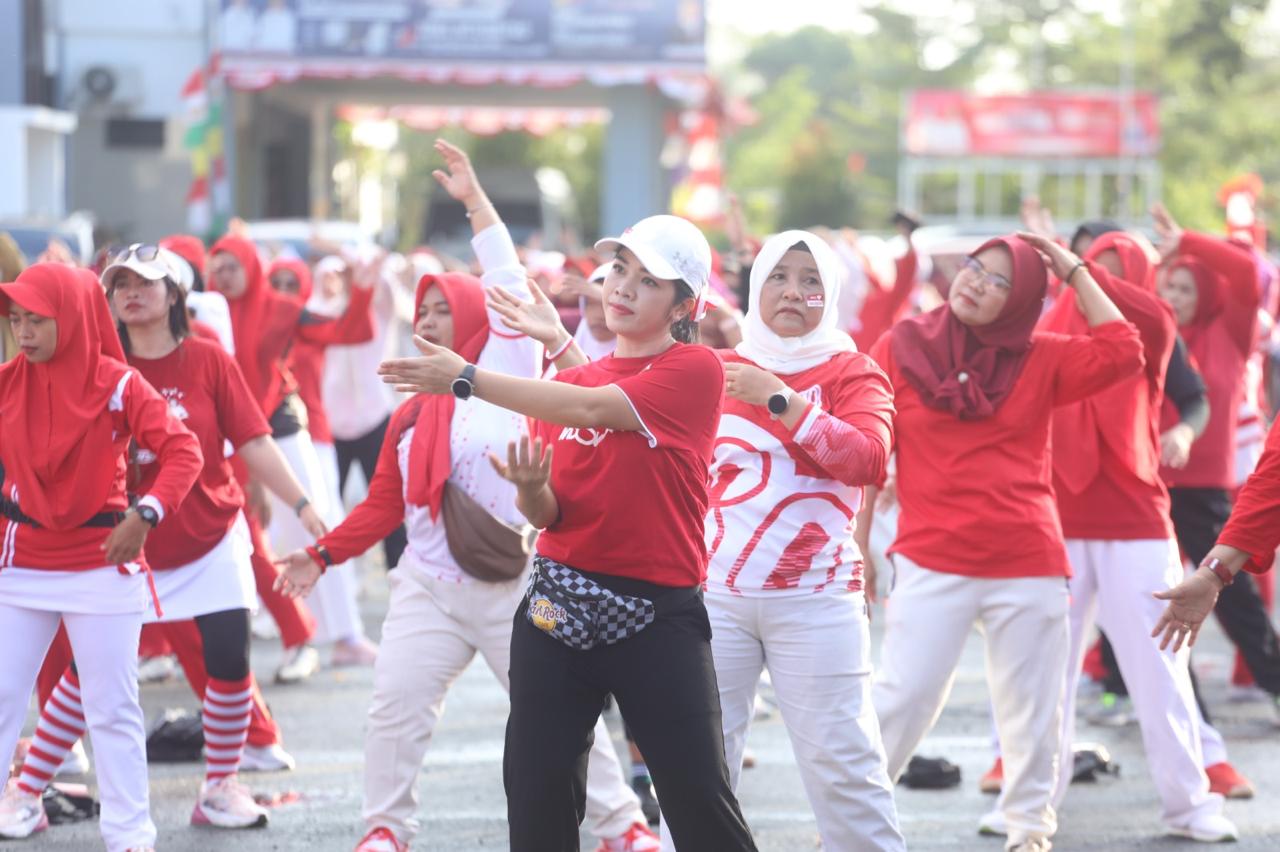 Dandim 1009/Tanah Laut Letkol Inf Adhy Irawan, S.I.P., M.H.I., bersama oleh Ketua Persit KCK Cabang XXXII Dim 1009 Ny. Dina Adhy Irawan turut serta mendampingi Bupati Tala H. Rahmat Trianto berlari menyusuri rute yang telah disiapkan oleh panitia.