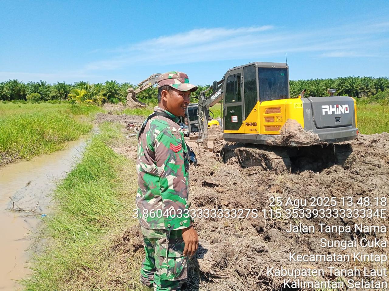 Dalam pelaksanaannya, di salah satu lokasi yakni di Desa Sungai Cuka, Kec. Kintap, Kabupaten Tanah Laut, Kopka Gatot Suharyanto Babinsa Koramil 1009-06/Kintap turun langsung ke lokasi untuk memantau dan mendampingi proses normalisasi aliran sungai oleh alat berat, Rabu (27/08/2025). Aliran sungai tersebut nantinya berfungsi sebagai sarana irigasi sekaligus mempermudah tata kelola air untuk mendukung pengolahan lahan rawa menjadi lahan pertanian produktif.