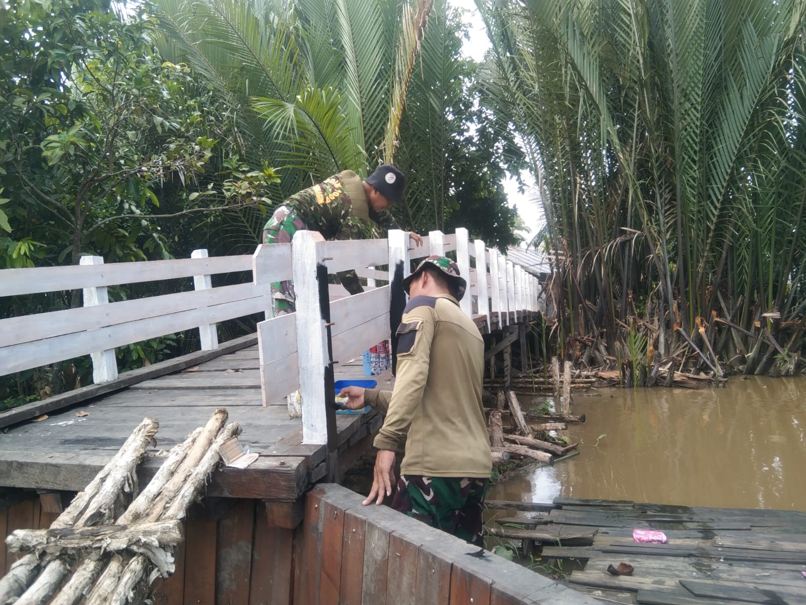 Banjarmasin – Teriknya matahari siang tidak menyurutkan langkah Satgas TNI Manunggal Membangun Desa (TMMD) ke-125 Kodim 1007/Banjarmasin. Dengan penuh semangat, personel Satgas melaksanakan pengecatan jembatan di lokasi sasaran, Kelurahan Mantuil, Kuin Kecil, Rabu (13/8/2025).