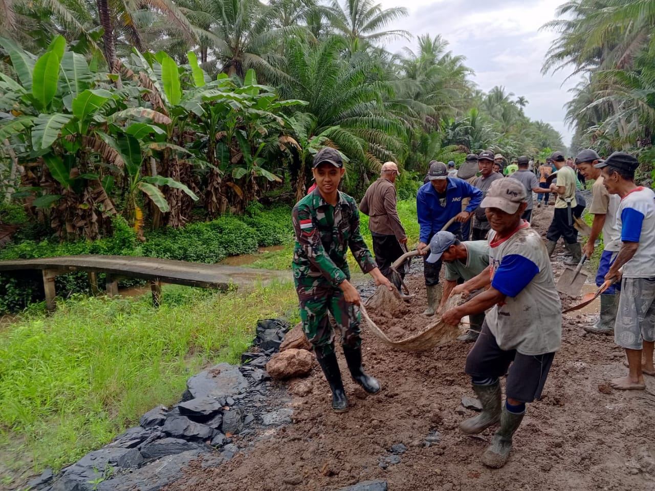 Sinergitas TNI Rakyat Anggota Koramil 04/Jawai Bersama Warga Gotong Royong Timbun Jalan