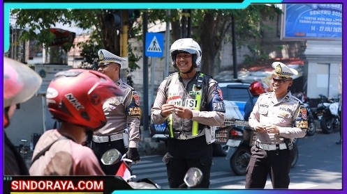 Foto : Kanit Kamsel SatlaFoto : Kanit Kamsel Satlantas Polres Gresik, Ipda Andreas Dwi Anggoro, dan Kanit Turjawali, Ipda Yoyok Subagya, bersama jajaran anggota membagikan pin dan bendera Merah Putih kepada pengguna jalan. (sindoraya.com)