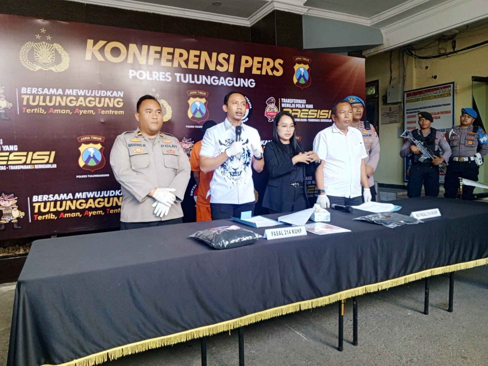 Kapolres Tulungagung,Ajun Komisaris Besar Polisi (AKBP)Muhammad Taat Resdi, S.H., S.I.K., MTCP. melalui Kepala Kesatuan Reserse Kriminal (Kasat Reskrim ) Ajun Komisaris Polisi (AKP) Ryo Pradana N, S.T.K., S.I.K., M.Si., menyampaikan hal tersebut dalam konferensi pers di halaman Polres Tulungagung, Senin (22/9/2025).