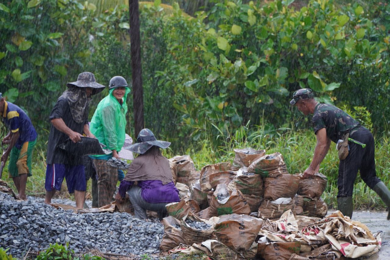 Dengan semangat gotong royong yang tinggi, para anggota Satgas bahu-membahu mengangkut batu menggunakan alat seadanya. Cuaca yang kurang bersahabat tidak menjadi penghalang bagi mereka untuk terus menuntaskan sasaran fisik TMMD sesuai target waktu yang telah ditentukan.