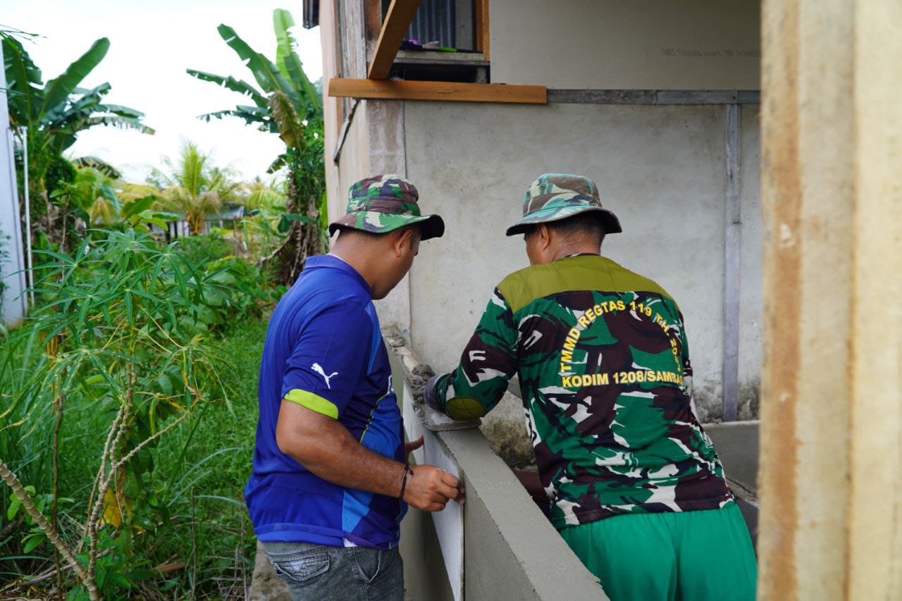 Sambas – Satgas TNI Manunggal Membangun Desa (TMMD) ke-126 Kodim 1208/Sambas terus menunjukkan dedikasi dan semangat tinggi dalam menyelesaikan sasaran fisik di Desa Ratu Sepudak, Kecamatan Sajingan Besar. Salah satu kegiatan yang sedang dikerjakan adalah proses plester dinding poskamling, yang merupakan bagian dari program perehaban fasilitas umum di desa tersebut.
