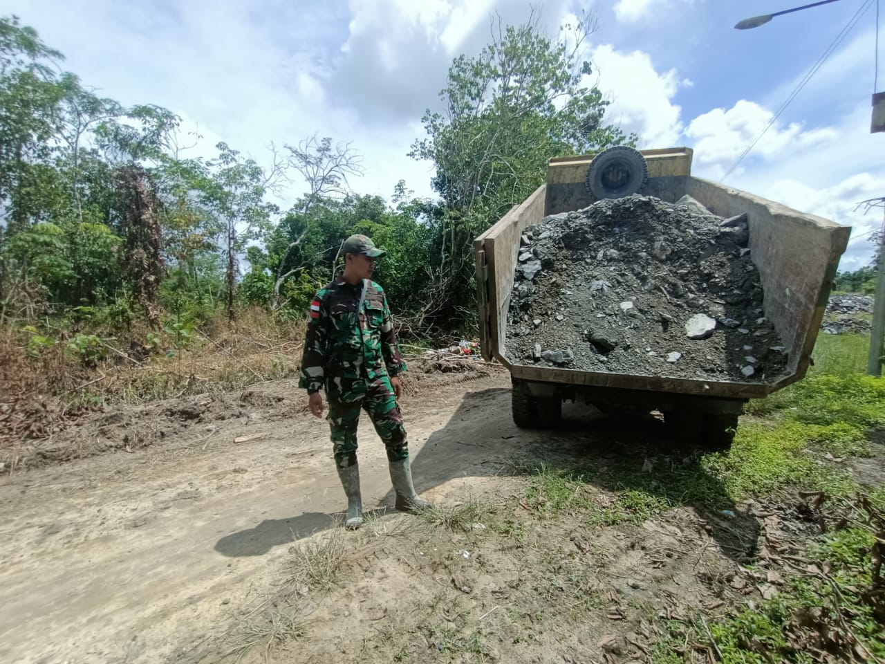 Sambas – Satgas TNI Manunggal Membangun Desa (TMMD) ke-126 Kodim 1208/Sambas terus melanjutkan proses penimbunan jalan di lokasi sasaran fisik program TMMD. Dengan memanfaatkan truk pengangkut material, personel Satgas bersama warga setempat bahu membahu menimbun badan jalan sepanjang 2000.