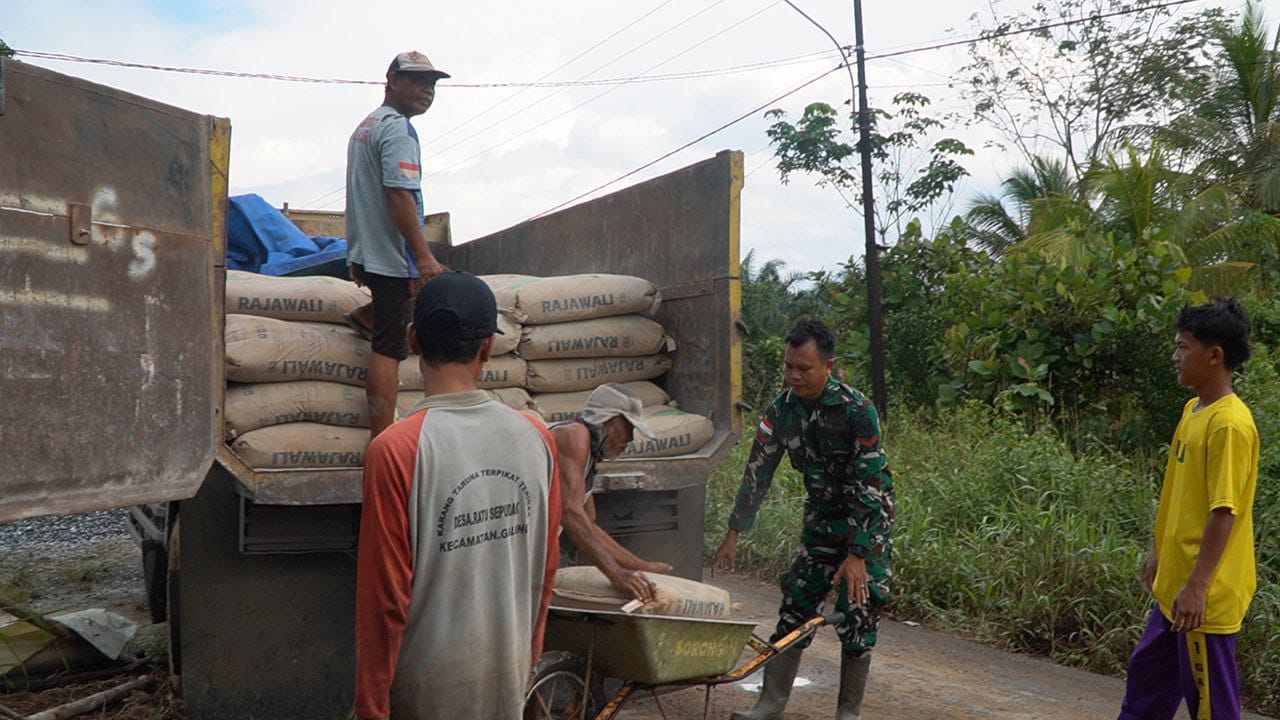 Dengan semangat gotong-royong, para anggota Satgas dan warga bahu-membahu memindahkan sak-sak semen dari truk ke titik penampungan di sekitar lokasi kerja. Meskipun di bawah terik matahari, kegiatan tersebut tetap dilaksanakan dengan penuh semangat dan kekompakan.