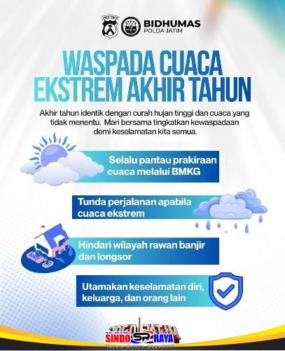 Sindoraya.com, Surabaya, – Polda Jawa Timur mengimbau masyarakat agar meningkatkan kewaspadaan terhadap potensi cuaca ekstrem yang diperkirakan terjadi pada akhir tahun 2025, khususnya di momen libur Natal dan Tahun Baru (Nataru).