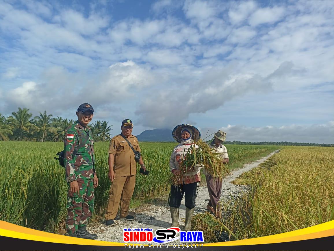 Babinsa Dan Kades Parit Baru Komsos Bersama Warga Saat Panen Padi