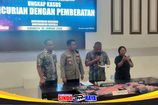 Sindoraya.com, Surabaya, – Polrestabes Surabaya mengungkap kasus pencurian dengan pemberatan yang terjadi di sebuah toko emas di kawasan Tambaksari. Pengungkapan kasus tersebut disampaikan dalam konferensi pers di Gedung Bhara Daksa Polrestabes Surabaya, Jumat (30/1/2026) sore.