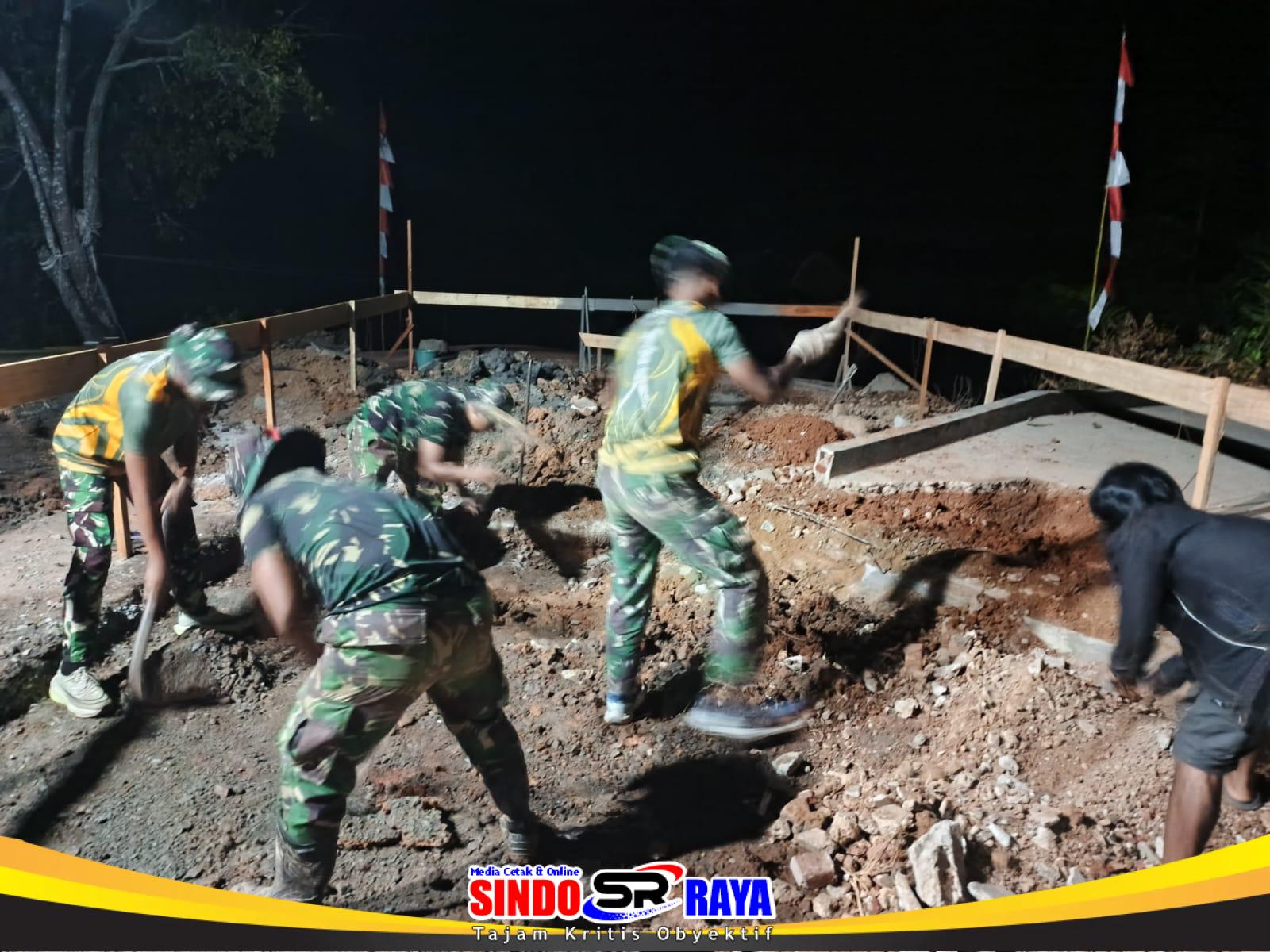 Semangat gotong royong tampak jelas di lokasi, meski pengerjaan dilanjutkan malam hari, para prajurit tetap fokus menyelesaikan setiap tahapan pekerjaan demi percepatan pembangunan infrastruktur yang sangat dinantikan masyarakat.