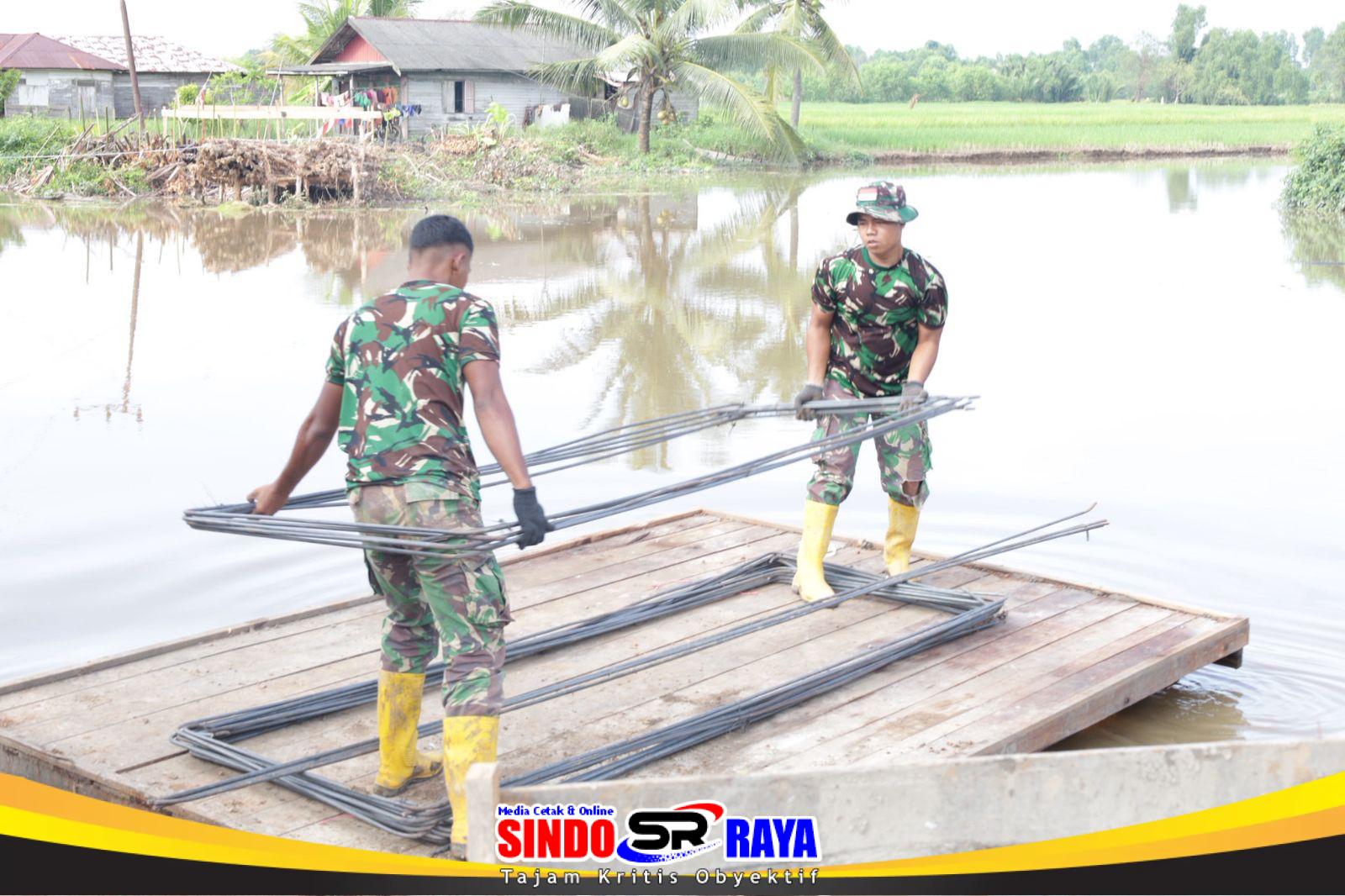 Dengan memanfaatkan sarana rakit sederhana yang sebelumnya telah dibuat, material seperti semen, pasir, batu, dan besi terus didistribusikan secara bertahap. Proses pengangkutan ini bukanlah perkara mudah. Selain harus melintasi jalur perairan, personel juga harus berjibaku dengan kondisi tanah berlumpur dan akses jalan yang terbatas.
